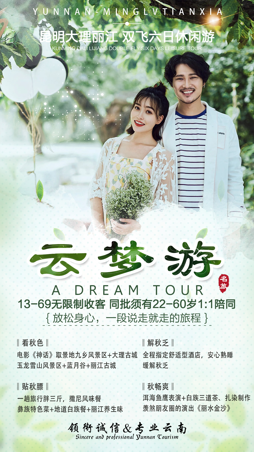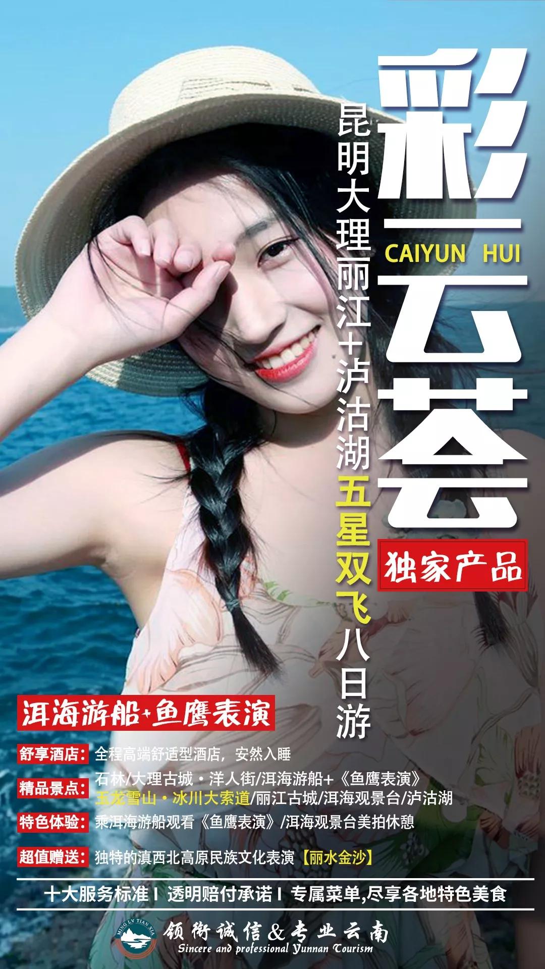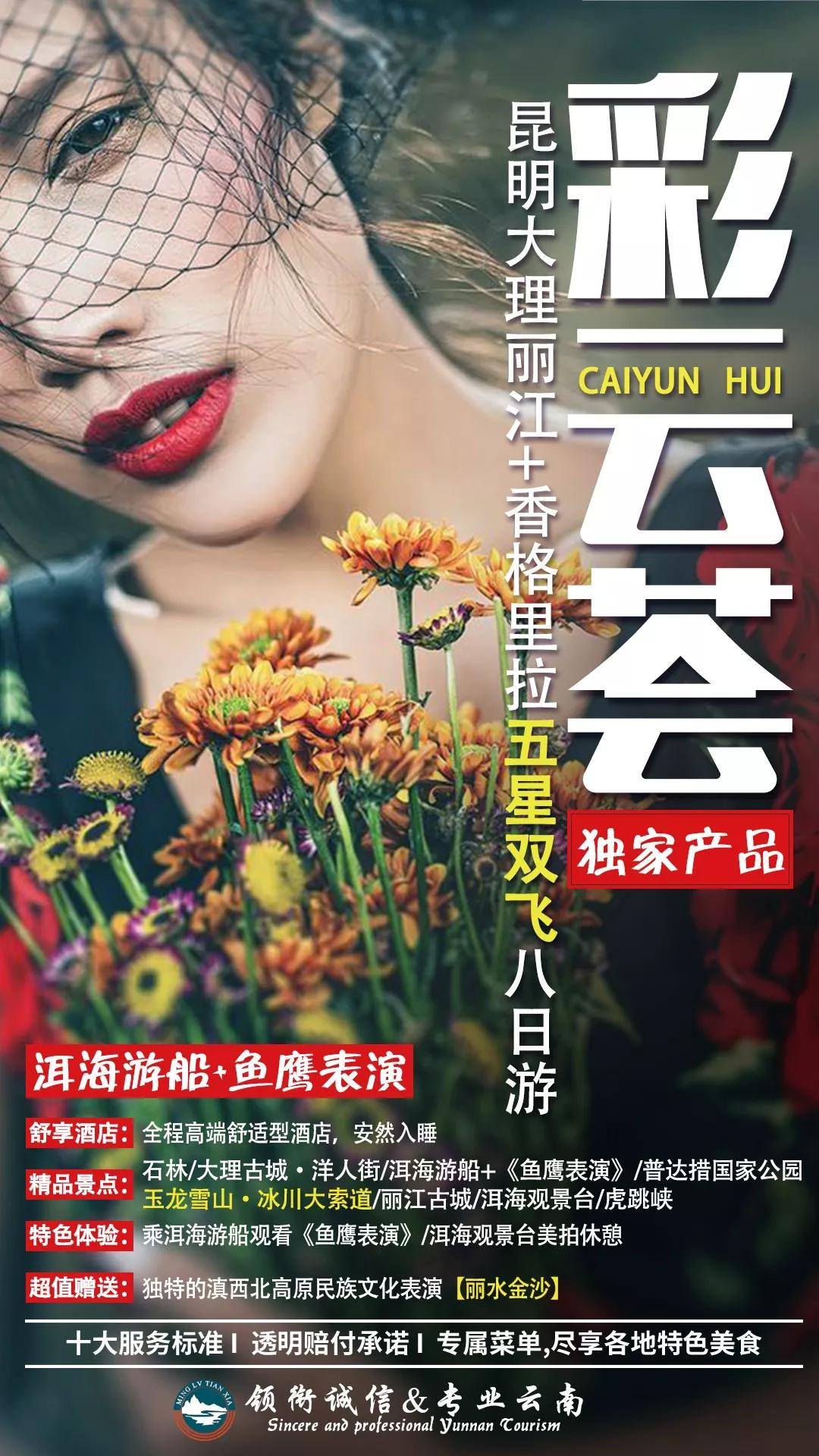 ▲“彩云荟 ”专属菜品云南美食,拥有一种藏在山水间的原味,就地取材,却不同食法。料广,色美,型巧,味全,看者胃开,闻者流涎,食者回味……你的味蕾,将从这里开始体验一场真实的美味之旅。▲“彩云荟 ” 十项服务标准+透明赔付承诺膳食——正规餐厅,定点用餐,菜单明示,确保品质 住宿——指定酒店,干净卫生,安全舒适,临变升级车辆——正规营运,四年之内,干净舒适,安全保障 接送——规范接机,随到随走,便捷送机,贴心送机司机——正规资质,着装整洁,持证上岗,安全驾驶 导游——正规资质,着装整洁,佩证上岗,规范服务景点——景点固定,不增不减,精华景区,时间充裕 购物——土特商品,货真价实,自由选购,自主消费自费——项目明确,价格透明,自愿原则,自主消费 质量——专人专线,即时处理,质量问题,限时反馈以上服务一旦出现问题,客人对我社处理结果不满意,现场赔付1000元/人/项。▲“彩云荟 ”安心出行设计● 全程空调旅游大巴,一人一正座。知识渊博、幽默的导游将带你一同游行趣味云南,为您提供专业导游服务的同时贴心为您解决旅程所遇一切问题;驾龄丰富的司机将为此趟精彩行程保驾护航,让您乘坐安心。 ● 我们为每一位游客购买云南旅游组合保险,多重安全保障,让您出行无忧。