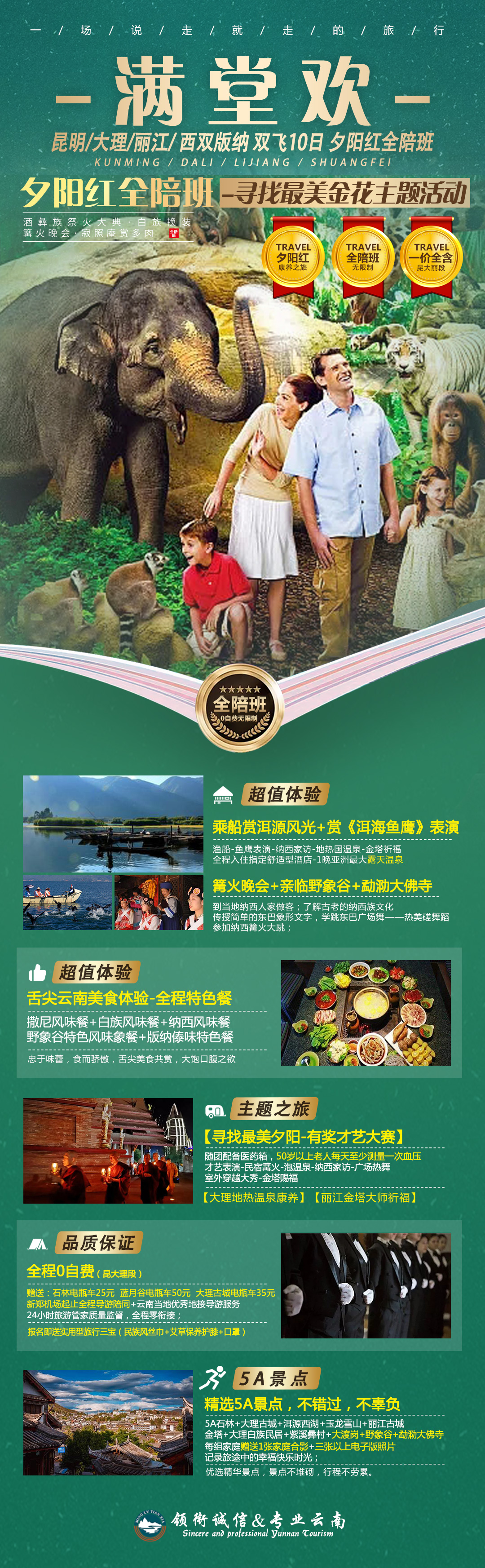 1 :产品理念——为老年人专属定制的高端夕阳红产品,让爸妈开心、让子女放心是我们的服务宗旨;2 :三大主题【寻找最美夕阳-有奖才艺大赛】【大理地热温泉康养】【丽江金塔大师祈福】3 :景点——5A石林、大理古城、洱源西湖、玉龙雪山、丽江古城、金塔、大理白族民居、紫溪彝村、野象谷、原始森林公园;4 :娱乐——乘特色游船赏洱源风光,观赏《洱海鱼鹰》表演,特别赠送纳西家访+篝火晚会+纳西盛装摆拍;5 :美食——特别安排撒呢风味餐+白族风味餐+纳西风味餐,感受舌尖上的云南;6 :服务——新郑机场起止全程导游陪同+云南当地优秀地接导游服务+24小时旅游管家质量监督,全程零衔接;7 :贴心——随团配备医药箱,50岁以上老人每天至少测量一次血压,行程中每人每天赠送一瓶矿泉水;8 :自费——昆大丽全程景区无自费,全程购物无强制消费,明明白白消费;版纳段自愿参加;9 :记忆——每组家庭赠送1张家庭合影+三张以上电子版照片,记录旅途中的幸福快乐时光;10 : 超值赠送——丽江+大理古维费80元+石林电瓶车25元+蓝月谷电瓶车50元+大理古城电瓶车35元/人;11:适合人群——20-75岁无年龄、无区域限制收客,老少皆宜的全景优质行程;12:神秘礼包:报名即送保障型旅行三宝(雨伞+口罩+便携式餐具实用安全细致周到)