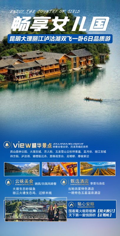 乘车前往乘车前往【泸沽湖】一个离天空很近的地方,这个有着极美景色闻名世界的“东方女儿国”。万山丛中,一颗巨大的明珠,在阳光下闪闪烁烁,发出迷人而耀眼的无色光,它便是充满神韵的泸沽湖。面对如此迷人的景色,想起了诗人赞韵西湖“晴方好”的诗句来,我想,泸沽湖就是大自然留下的,最珍贵的宝藏了。前往泸沽湖最美的【情人沙滩】,在这里客源零距离接触泸沽湖,之后沿着环湖抵达泸沽湖最美观景台【里格观景台】在这里可以看到最美的泸沽湖,在观景台您可以看到泸沽湖的全貌,它已经等您几亿年了,终于等到您啦。在这里您不用拍照技术都能照最美的照片,