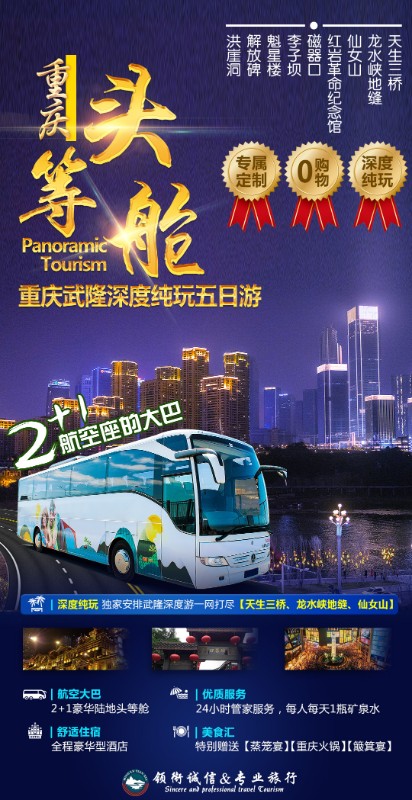 6、渝东南是个多民族的地区,当地以麻辣口味为主、凉菜居多;旅游的团队餐一般是10人一桌,重庆饮食和其他省份有较大差异,可能不合您的口味,请作好心理准备;当地水土为麻辣,建议多饮茶水。