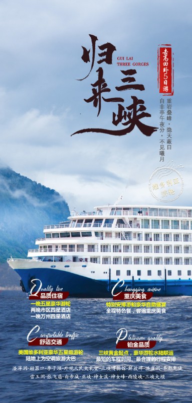 【交通】:三峡段游船为美国维多利亚豪华五星级系列游轮。重庆-奉节陆路行程为空调旅游大巴,保证一人一正座(根据实际出团人数定车型)。