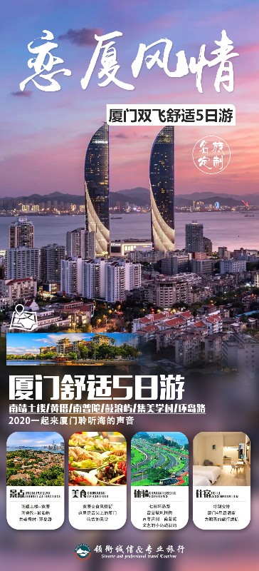 早餐后,前往参观【海洋珍宝馆】,安排参观【丝绸展示厅】,后游览【集美学村】(游览时间不少于40分钟)集美学村在陈嘉庚先生亲自指导下创立,其建筑融中西风格于一炉,体现了典型的闽南侨乡的建筑风格。无论是高大壮观的校舍堂馆,还是小巧典雅的亭台廊榭,无一不是琉璃盖顶、龙脊凤檐、雕梁画栋,而细细看去,却又各具匠心。学村中的龙舟池节假日常举行带龙舟,鼓乐齐鸣,南音悠扬,把平日宁静的校园变成欢乐的海洋。中餐后,参观【厨具展示中心】,赠送【七彩环岛路】(游览时间不少于20分钟):为国内第一条海滨环岛彩色公路,绿色的大山,青色的植被,黑色的主干道,红色的人行道,黄色的沙滩,蓝色的海洋,像惠安女那条彩色腰带系在厦门这个美女的少女身上,婀娜多姿,美不胜收。游览【曾厝垵风情街】这里有很多富有情调的咖啡厅、餐吧、个性小店在此云集,在这里品尝一下当地的特色蚵仔煎(鸡蛋搅散,加入大量新鲜海蛎,以油煎之,摊成一盘饼样 ),土笋冻(土笋冻是用海产的“笋”---厦门人叫“土蚯”加工烹制的冻品,具有鲜嫩清脆、晶莹剔透、凉喉爽口等特点,各种美食享不停。游【疯狂的赛车】拍摄场地,素有东方夏威夷之称的海边马拉松赛道—环岛路,在环岛路上可以自由拍照,也可以赤脚前往路边的环海木栈自由奔跑,静静享受大海的博大。