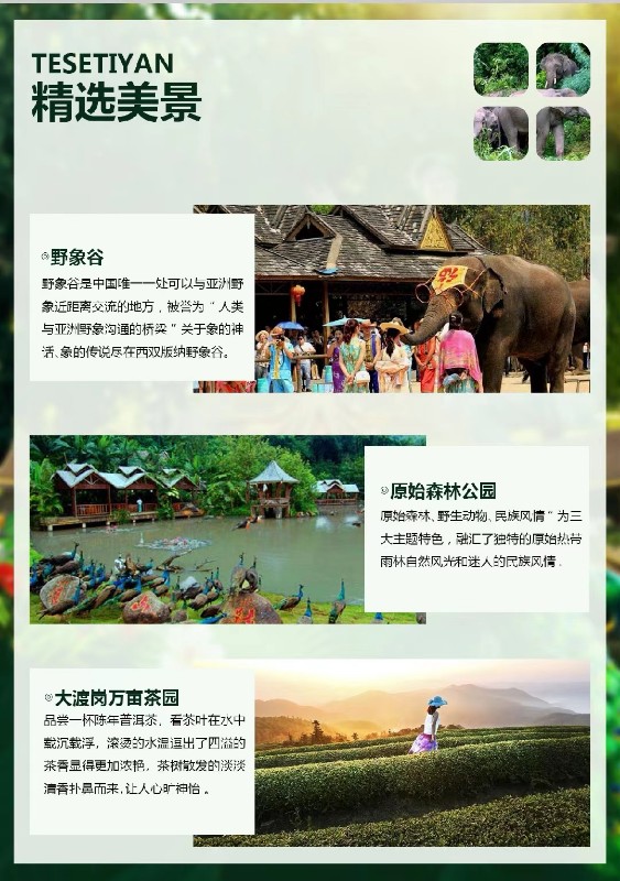 早餐后,参观【大渡岗万亩茶园】(约90分钟),清晨,茶园烟雾云绕,茶尖经过露水的洗礼后,闪现着晶莹剔透的亮光,在黎明破晓的第一缕阳光下,看采茶工人开始一天的辛勤劳作。品尝一杯陈年普洱茶,看茶叶在水中载沉载浮,滚烫的水温逗出了四溢的茶香显得更加浓艳,茶树散发的淡淡清香扑鼻而来,让人心旷神怡 。随后乘车穿越热带雨林前往AAAA级旅游风景区--【野象谷】(自愿自费空中索道(不推荐乘坐):单程50元/人,往返70元∕人 (约游览120分钟):在中国看亚洲野象,必须到西双版纳,到西双版纳看野象,又必须到野象谷。从激流到静水,从土壤到地表,从草丛到灌林,从林下到林冠,都是动物们栖息地所在,这片土地就是他们的家园。古有"乘象国"之称的西双版纳,如今依旧能见到大象的身影:象树、象牙树、象鼻树,还有象织锦、象工艺品、象壁画、象雕塑,甚至神象"掌月郎宛"、关于象的神话、象的传说……可观蝴碟馆、百鸟园、蟒蛇园、穿越热带雨林、观看大象表演;