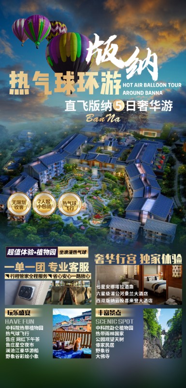 后体验【中科院热带植物园热气球飞行】,在现代热气球于1982年引入中国之前,热气球的鼻祖—“孔明灯”,已在西双版纳这片热土放飞了上千年。热气球被国际航空联合会列为最安全的飞行器,在我国被归为民用航空器,与飞机一样需要取得国家民航局颁发的国籍证和适航证。热气球同时也是一项时尚、浪漫的航空体育运动,并作为当今最热门的低空旅游项目,在国外蓬勃发展。近年来,热气球项目也在国内崭露头角,以其新颖、独特、时尚、浪漫、巨大而又五彩缤纷的外表伴随居高临下、御风而行的飞翔体验吸引着无数的人们趋之若鹜。中科院西双版纳热带植物园热气球飞行体验项目位于云南省西双版纳傣族自治州唯一的国家5A级景区--中国科学院西双版纳热带植物园内。依托全亚洲最大的热带植物园得天独厚的自然风光,热气球从百花园、民俗博物馆场地起飞升空,蓝天、白云、清风等待你的拥抱;四季斑斓的鲜花和雨林、造型奇特的葫芦岛、古灵精怪的植物迷宫、由远及近的山川河流人间烟火尽收眼底……。那一刻,飘浮空中、俯瞰大地;那一刻,远离喧嚣、感受纯净;那一刻,时空凝滞、身心洗礼!