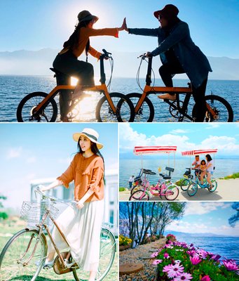 之后前往洱海绝美亲水线体验【梦幻海湾骑行】,蓝天碧海,骑着单车享受海风吹拂,一路风光旖旎,看洱海波光粼粼,湖光山色尽收眼底,感受苍山洱海间的浪漫,文艺感十足。