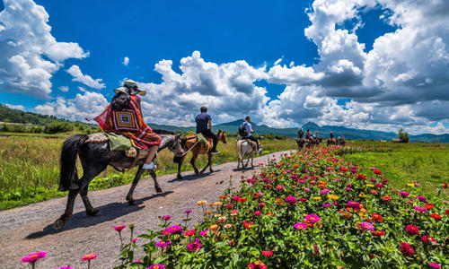 随后游览大理的新名片【花语牧场】,这里绝对是您赏花拍照的不二之选,在风花雪月的大理,花开四季,无论是夏秋,还是严冬,都拷贝了那春季花开。无论你什么季节归来,都陪你尽赏花海白云间,缤纷的格桑花、洁白的醉蝶花、火红的一串红,让你置身花的海洋……