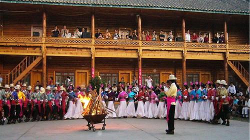 午餐后乘车前往传说中的“女儿国”泸沽湖,抵达【泸沽湖观景台】观景台位于泸沽湖湖域东岸,植被密布,在此可一览泸沽湖全景,是远眺泸沽湖的最佳地点,让人不自禁地甘愿沉默,感受时光流淌的美好。之后乘车前往【情人滩】情人滩有大片浅滩,湖水清澈可看见明黄的湖底,长长的栈桥伸到湖中,与垂柳相映成趣,营造出浪漫的氛围。接着继续乘车前往【里格观景台】群山环绕,碧天白云,一览天中景,碧玉般的胡泊下映衬着巍峨的山岭感觉触手可及,忽近忽远。当您一饱眼福之后接着乘车抵达【摩梭走婚宴】摩梭族走婚名闻遐迩,听起来颇具神秘感,在这您能领会母系氏族的民族文化。晚餐后乘车观看【篝火晚会】是泸沽湖的传统娱乐项目,跳“锅庄”舞是摩梭青年男女相互认识、结交“阿注”的大好良机,通过跳舞,他们彼此相识、相恋、相知,直到结成“阿注”婚姻(即母系氏族的走婚形式)。锅庄舞就是摩梭人的“打跳”,又称“甲搓舞”。表演结束后乘车返回酒店。