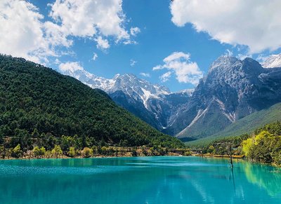 之后前往游览【蓝月谷】(赠送电瓶车,赠送项目赶不上/自愿放弃或者电瓶车停开等不用不退费),源自雪山的万古冰雪消融之后顺着峭壁流淌而下,不断汇集为山涧、溪流,最终在蓝月谷中形成了清澈见底、甘冽无比的河流。晴天时,水的颜色是蓝色的,山谷呈月牙形,远看就像一轮蓝色的月亮镶嵌在玉龙雪山脚下。行程结束后,前往入住酒店。