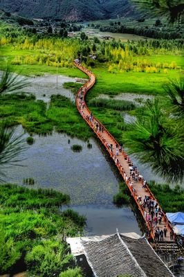 前往游览【草海走婚桥】,这座桥不仅是连接草海两岸的通道,更是摩梭文化中男女青年走婚仪式中不可或缺的一部分,因此被赋予了浪漫的文化意义,吸引着众多游客漫步其上,体验独特的文化氛围。