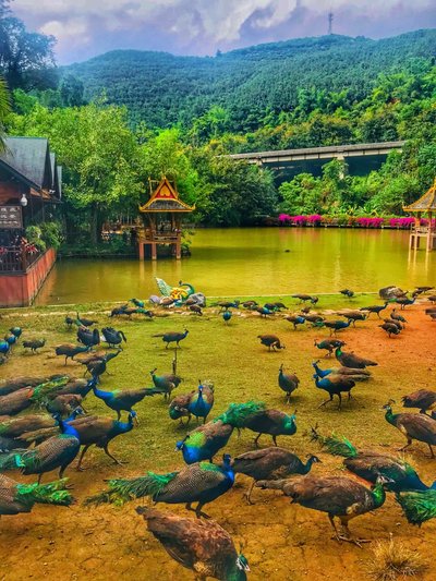 中餐后前往AAAA级景区【原始森林公园】, 车程约30分钟左右,(游览时间约180分钟,不含电瓶车60元/人)森林公园是离景洪城最近的一片原始森林。在25000亩热带沟谷雨林的基础上创建,园内森林覆盖率超过98%,是个天然的大氧吧。有沟谷雨林、孔雀飞舞、民俗歌舞、美食、泼水狂欢等项目,突出体现了“原始森林、野生动物、民族风情”三大主题。里面饲养着400多只绿孔雀,让人观赏孔雀开屏,孔雀放飞壮景。里面分布有大面积的热带沟谷雨林,游客可顺游览道深入西双版纳林中探秘。雨林内有猿猴栖息,有彩蝶繁殖,西双版纳犀鸟、野牛等珍稀物种也偶有出现。幸运的游人会遇到猿猴攀枝嬉戏、西双版纳犀鸟在林中觅食的情景。