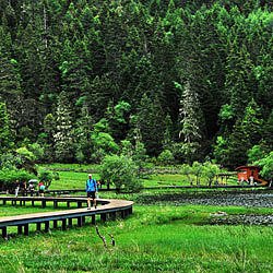 午餐后前往【普达措国家森林公园】(普达措国家公园是一个无任何污染的童话世界,湖清清,天湛蓝,林涛载水声,鸟语伴花香,一年四季景色各不相同。,漫游花海草甸,走进森林成毡的净土,赏雪域高原上的美丽湖泊属都湖,观赏茂密原始森林。