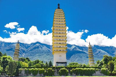 早餐后乘车前往游览【崇圣寺·三塔】(赠送电瓶车)崇圣寺三塔是大理“文献名邦”的象征,是云南古代历史文化的象征,也是中国南方最古老最雄伟的建筑之一。是大理国时期的皇家寺院,妙香佛国,已有千年历史,国家级AAAAA风景区,也是大理历史文化的象征,其主塔千寻塔与西安大小雁塔同是唐代的典型建筑,站在塔下仰望,只见塔矗云端,云移塔驻,似有倾倒之势。金碧辉煌的皇家寺院、绿水,蓝天,三塔雄姿倒映水中……美不盛收。