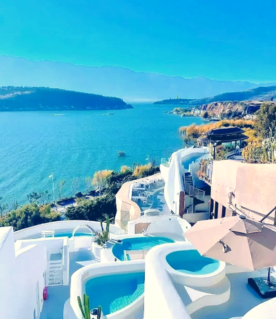 午餐后乘车前往抖音最网红景点,有中国圣托里尼之称的【理想邦】,在这里我们特意安排了准备了【音乐下午茶】,浪漫从这里开始。蓝色浪漫,白色纯净,温柔与风和白云一样恍惚,(带着美美的、帅气的衣服),在这里随便一拍都是大片。蓝天像被洗涤晒干了的蓝色一样浪漫。风花雪月里的悲欢离合,山海之间的秘境,民族与文化的交融等等无数宝藏传说都藏在这苍穹绿地里。