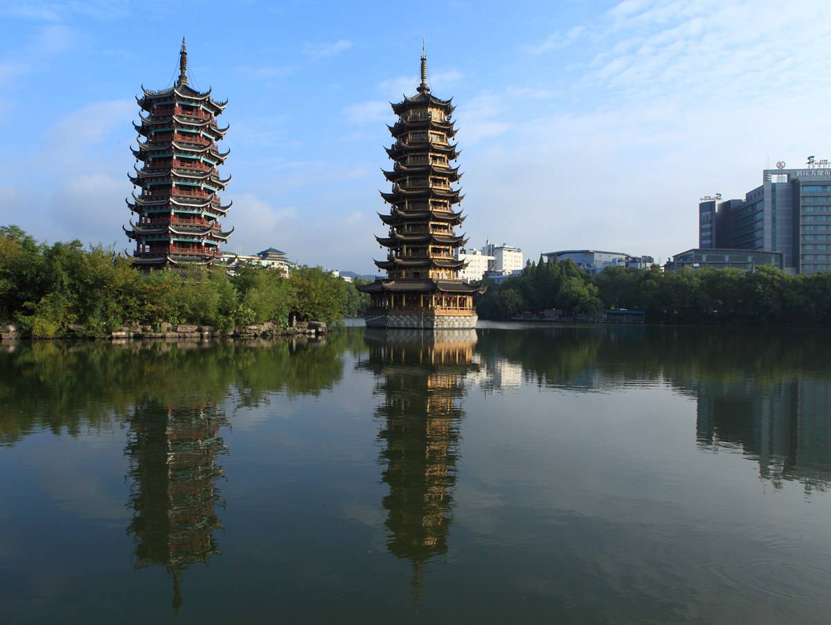 后可自由漫步游览桂林城市新地标--【日月双塔】远观(约60分钟),它座落在桂林城的中轴线上,与象山上的普贤塔、塔山上的寿佛塔,相互呼应,相互映衬,有“四塔同美”之说,是两江四湖环城水系中最著名的旅游景点。步行桂林【杉、榕湖新景】(温馨提示:司导不陪同,自行活动期间请游客注意安全。)