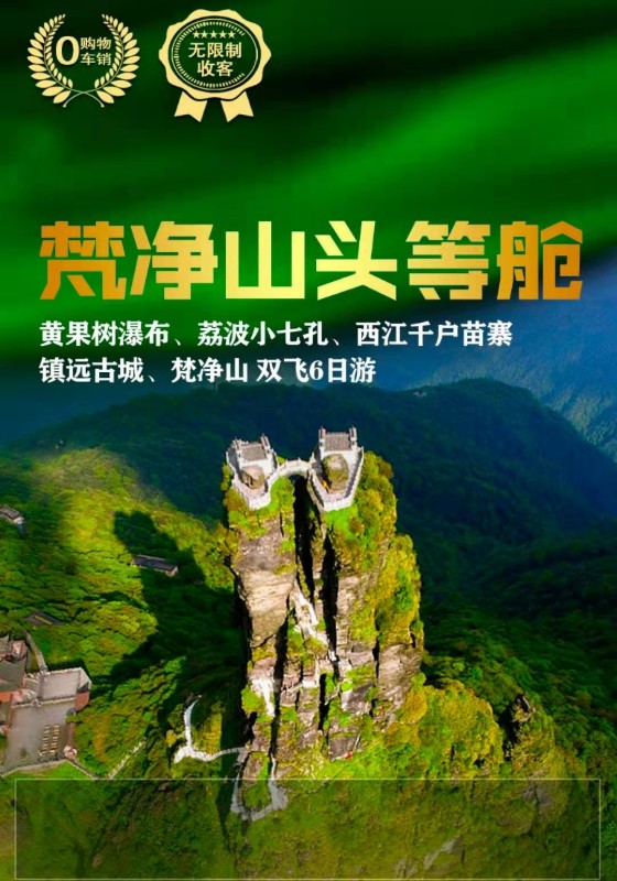 3、不含景区内自费项目:不含黄果树大瀑布扶梯单程30元/人、往返50元/人,小七孔鸳鸯湖游船30元/人,梵净山东门往返索道140元/人(徒步登山单程需4小时,故建议乘坐),可根据个人需要自愿选择消费。