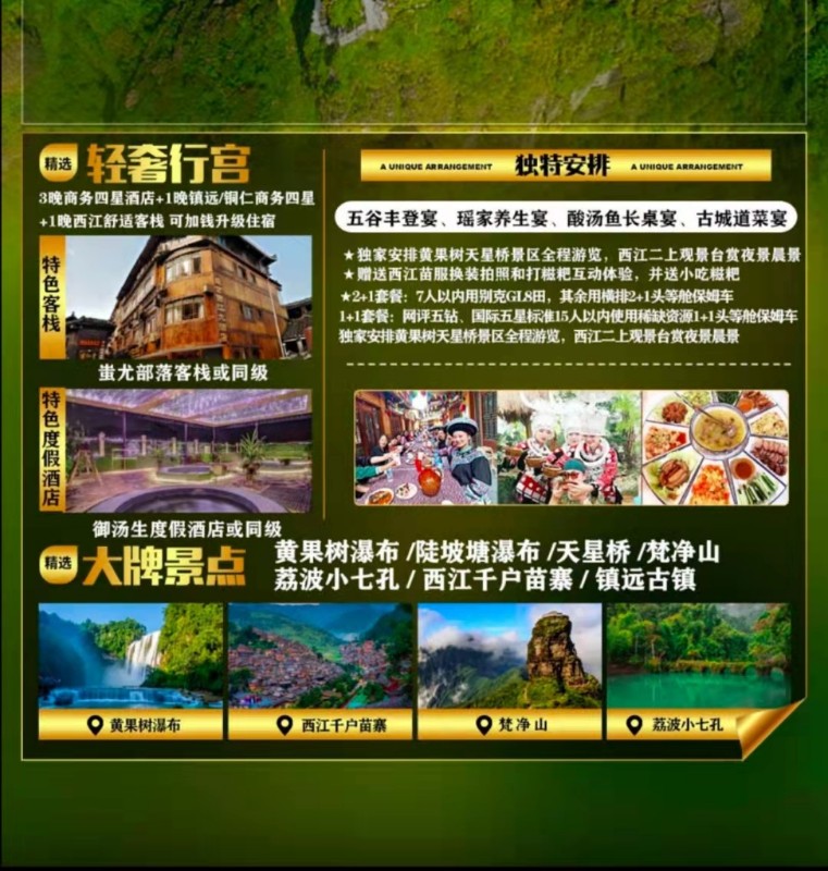 2、不含景区小交通:黄果树观光车50元/人+保险10元/人,小七孔观光车40元/人+保险10元/人,西江苗寨观光车20元/人+保险10元/人,镇远摆渡车20元/人,梵净山观光车20元/人,费用需自理。