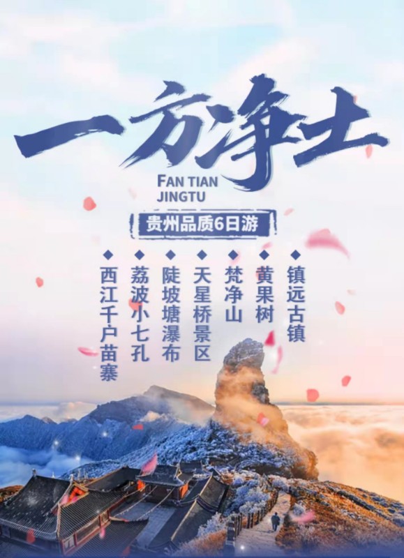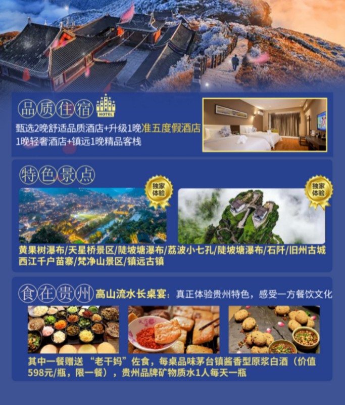 【精华景点】:【黄果树瀑布】国家5A级景区,世界自然遗产,亚洲第一大瀑布,由黄果树景区,陡坡塘景区、天星桥景区三大板块组成;【荔波小七孔】世界遗产地,地球腰带上的绿宝石,【西江千户苗寨】国家4A级景区,世界最大的苗族聚居村寨;世界的银都、苗绣之都,【镇远古镇】两千多年的古城,中国山地贴崖建筑文化博物馆,东方威尼斯,驻足欣赏风光迷离的镇远夜景;【梵净山】国家5A级景区,世界自然遗产,中国第五大佛教名山、弥勒菩萨道场,生态王国,顿悟梵天净土;【贵阳】爽爽贵阳,森林之城、避暑之都