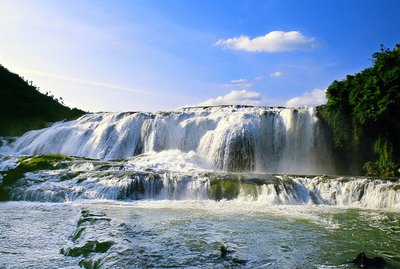 然后游览《西游记》拍摄地【陡坡塘瀑布】(游览约半小时)它位于黄果树瀑布上游1公里处,它是黄果树瀑布群中瀑顶最宽的瀑布。陡坡塘瀑布有一个特设的现象,每当洪水到来之前,瀑布都会发出轰隆的吼声,因此又叫吼瀑。